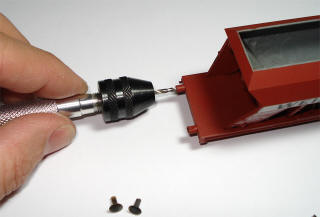 PufferAn den Wagen fehlten die meisten Puffer – ein übliches Problem. Ausserdem waren die Seitenwände verkratzt und eine Bremserbühne samt Geländer fehlte. Diese Teile lassen sich natürlich mit originalen Ersatzteilen ersetzen. Meist dauert die Lieferung aber recht lange, falls diese überhaupt noch erhältlich sind. Einfacher und schneller geht der Selbstbau. Dazu verwende ich für die Puffer Messingstifte mit Halbrundkopf aus dem Baumarkt. Die Stifte haben einen Durchmesser von 2 mm, der Kopf passt vom Durchmesser sehr gut zu den noch vorhandenen Puffern. Achten sie beim Kauf aber darauf, dass es sich um echte Messingstifte handelt, und nicht um vermessingte Stahlstifte. Bei den Puffern hat beim Original jeweils einer eine runde Form, der andere ist abgeflacht. Der Flache ist - auf die Puffer gesehen - rechts. Merken kann man sich dies mit der 3-R Regel: Steht man mit dem Rücken zum Wagen, ist der runde Puffer rechts (Rücken – rund – rechts). Um die Stifte abzuflachen werden diese in die Tischbohrmaschine eingespannt und mit leichtem Druck auf ein darunter liegendes Stück Schleiftuch oder eine feine Feile gepresst. Nun bekommen die Puffer ihre endgültige Farbe. Dazu verwende ich von Fohrmann die Brünierbeize für Messing, ebenso gut geht dies auch mit dem so genannten Pariser Oxyd, welches über den Goldschmied bezogen werden kann. Die Stifte werden kurz mit einer Kunststoffpinzette in die Lösung getaucht und anschliessend unter kaltem Wasser abgespült. Je nach Wagen müssen auch noch die Pufferhülsen angefertigt werden. Dazu kann ein dünnwandiges Messingrohr mit 2mm Innendurchmesser verwendet werden, von welchem kurze Stückchen mit einer feinen Laubsäge abgeschnitten werden und ebenfalls gefärbt werden. Bei den Liliput Wagen ist dies jedoch nicht nötig, es muss hier lediglich das Loch auf 2mm vergrössert werden, was sehr gut von Hand geht. Die neuen Puffer werden danach mit ganz wenig Sekundenkleber befestigt. Am besten gelingt dies, wenn die Stifte zuerst ohne Kleber eingesetzt werden, und anschliessend von der inneren Seite der Pufferbohle wenig Sekundenkleber mit einer Nadel aufgebracht wird. Der flüssige Kleber dringt sofort in die Ritze und hält den Puffer dauerhaft fest. WagenladungDas Innere der Wagen sah hässlich aus. Aus diesem Grund – aber auch weil beladene Wagen schöner aussehen als leere – habe ich beschlossen, diesen Wagen eine Ladung Kies zu verpassen. Dies geht hier sehr einfach. Um Gewicht zu sparen, was letztendlich sowohl der Zugkraft der Lok entgegenkommt und die Wagenachsen schont, wird zuerst ein Stück Styropor eingesetzt. Dieses lässt sich gut mit einem scharfen Messer oder mit einer Styroporsäge zurechtschneiden. Anschliessend wird Sand darüber angehäuft. Die Höhe der Ladung entspricht bei meinen drei Wagen exakt dem Vorbild. Ich hatte einmal die Gelegenheit, aus einem stehenden Doppelstockwagen heraus die beladenen Wagen auf dem Nachbargleis fotografieren zu können. Als Sand habe ich einen dunkelgrauen Sand aus dem Aquariumbedarf (Zoohandlung) gewählt.