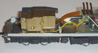 Als erstes wird das Motordrehgestell ausgebaut und zerlegt. Elektrischer AnschlussWie oben beschrieben wird zwischen Decoder und Motor die Treiberelektronik angeschlossen. Jetzt können aber gewisse Decoder nicht programmiert werden, wenn kein Motor am Ausgang hängt. Die Treiberelektronik reicht als Last dafür nicht aus. Gelöst wird dieses Problem mit einem Widerstand, welcher zusätzlich zum Treiber am Decoder-Motorausgang angeschlossen wird (parallel!). Ich habe hierzu einen Widerstandswert von 120 Ohm und 1 Watt Leistung verwendet. Der Widerstand wird während dem Betrieb recht warm, Werte unter 1 Watt sollten nicht benutzt werden. Damit die ganze Verdrahtung sauber aussieht, habe ich eine kleine Trägerplatine aus einem Stück Leiterplattenmaterial hergestellt. Darauf kann sowohl der Decoder, die Treiberelektronik wie auch der Widerstand angebracht werden. Zwei Flächen als Lötstützpunkte für Widerstand und Motoranschlüsse wurden im Kupfer gefräst. FahreigenschaftenAls Decoder