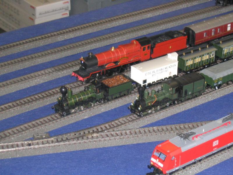 Epoche I Züge aus Deutschland und England. Die BR 185 hat sich absichtlich in die Dampflokzeit verirrt. Michael demonstrierte uns die beeindruckend schönen echt-weissen LED. Leider muss hier der Märklinist erst selbst zum Lötkolben greifen... Die Original-LED sind p...gelb |