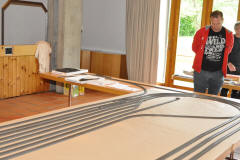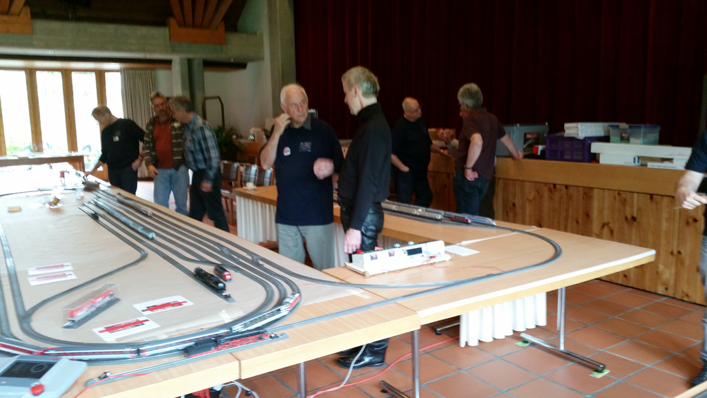 Abstellgleisen erweitert. Die rot gekennzeichneten Gleise sind neu. Die Anlage ist nun U-förmig, die vier neuen Abstellgleise sind somit von beiden Seiten zugänglich. Auf den Fotos unten ist die Anordnung der Tische gut zu sehen. Vorteile dieser Anordnung sind: