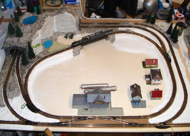 Spur N AnlageDamit auf der Spur N Seiten auch ein paar Bilder stehen, hier einige Bilder der kleinen Anlage meiner Frau. Sie hat sich für die Spur N entschieden, da mit dieser Spur einerseits auf kleinem Raum einer Anlage realisierbar ist, andererseits die Teile nicht ganz so winzig sind wie bei der Spur Z.