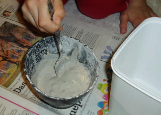| Der Gips wird nun aufgetragen. Dabei werden wieder