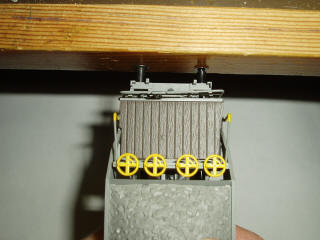BlechcoilsAuch etwas für schnell zwischendurch ist die Herstellung von Blechcoils. Ich verwende dazu braunes (rostfarbenes) Tonkarton. Dieses wird in Streifen geschnitten und um ein Holzspiess gerollt. Etwas Leim in der letzten Lage hält das Ganze zusammen. Diese Rollen werden dann mit Metall-Lack angemalt. Zum Schluss werden noch dünne Drähte darumgewickelt. Zum transportieren werden die Coils auf einem Holzgestell geklebt.